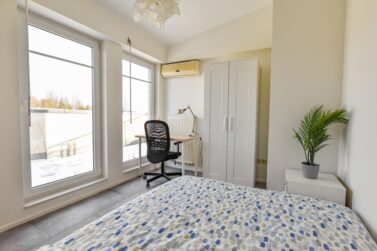 This furnished double bedroom is in our new project 'DURER III'. The flat is located in Cents with easy connection to the airport, Kirchberg and Gare Centrale. It has a fully equipped kitchen, one main shower, and two spacious balconies.