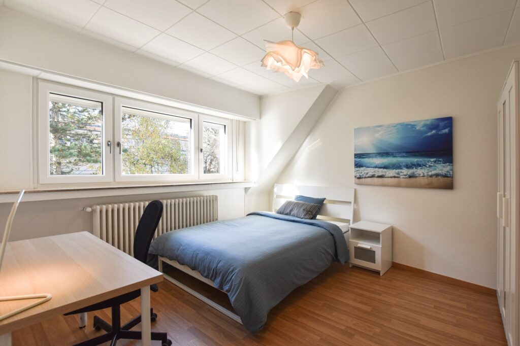 The furnished double bedroom (E) is in a brand new shared house (Haring) with brand new kitchen, a roomy lounge and a dining area. This spacious house has just been completely redone and has 5 newly funished bedrooms with 1 new main bathroom with a hammam bath and 2 guest toilet. The house is located in a residential area of Limpertsberg, right next to cafes, bakery and 2 bus stops. The main parking (Glacis) is 15min walk away.