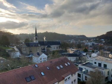 On the road to Kirchberg, about 2.5km from the European Investment Bank (EIB). There is a bus stop right outside with buslines L25 and L8 that run every 10min, the train station is at 3minutes on foot.