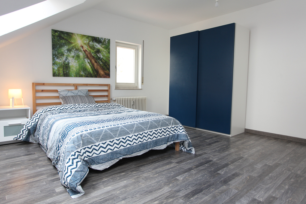 The really superior large and fully furnished double bedroom (E) is on the 2nd floor of the modern brand new duplex (Cezanne) with large windows, an open balcony and plenty of natural sunlight. It has an excellent view onto the valley and is closely located to Kirchberg as well as 400m from the train station. It has a kitchen with a dining area, common area upstairs, one main bathroom, a guest toilet.